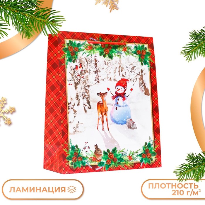 Пакет подарочный «Зверята у снеговичка», 18×22.3×10 см