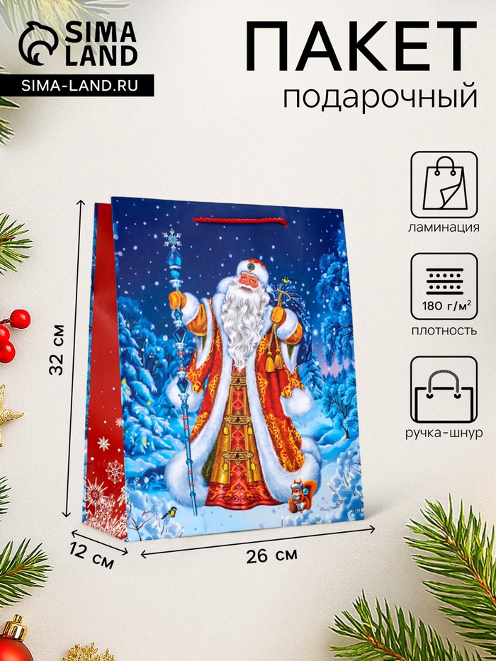 Пакет подарочный новогодний ламинированный, «Дед Мороз в лесу» , 26×12×32 см