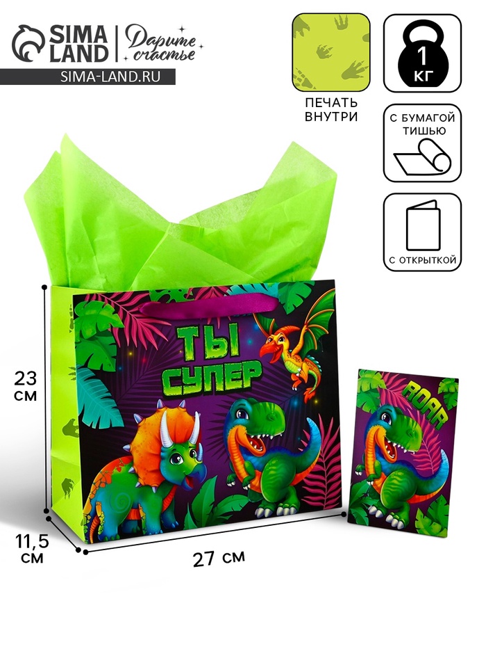 Пакет ламинированный двухсторонний «Динозаврики», с тишью и открыткой, ML, 23 х 27 х 11.5