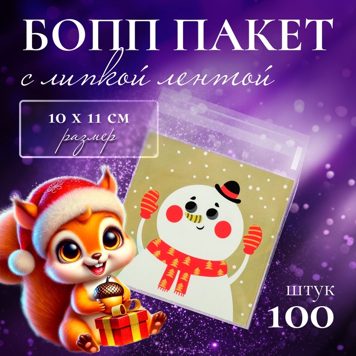 Пакет БОПП с липкой лентой, «Снеговик», 10×11 см