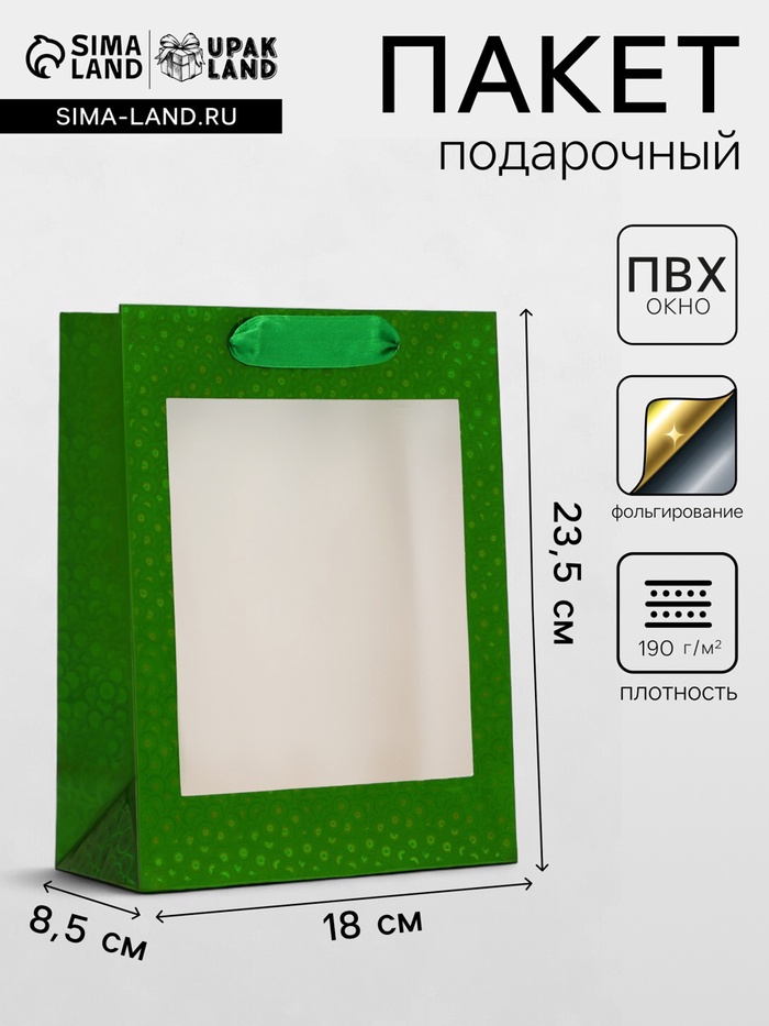 Пакет подарочный, фольгированный, упаковка, с окном, «Зеленый», S 23.5×18×8.5 см