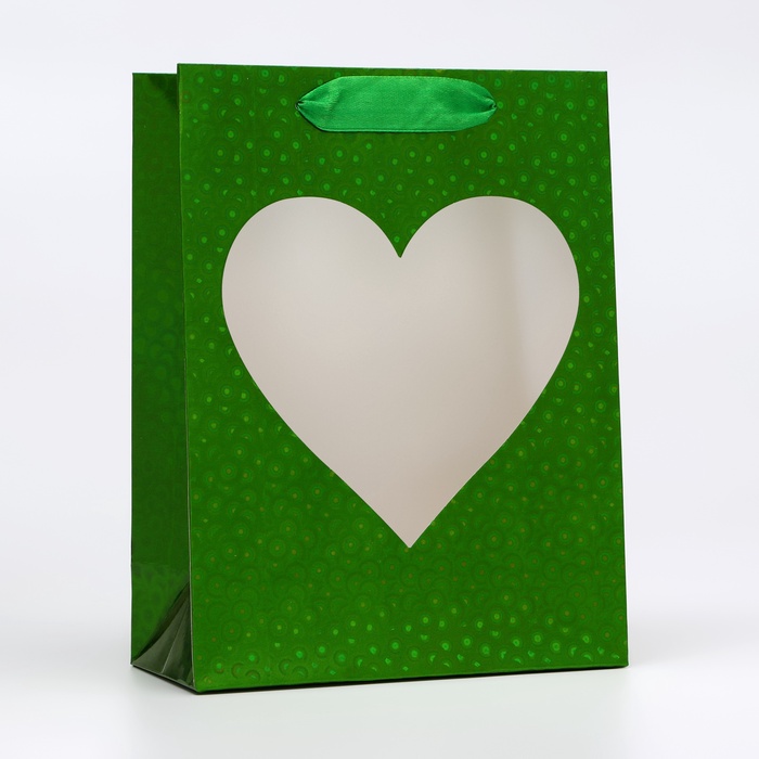 Пакет подарочный, фольгированный, упаковка, с окном «Сердце», «Зеленый», S 23.5×18×8.5 см