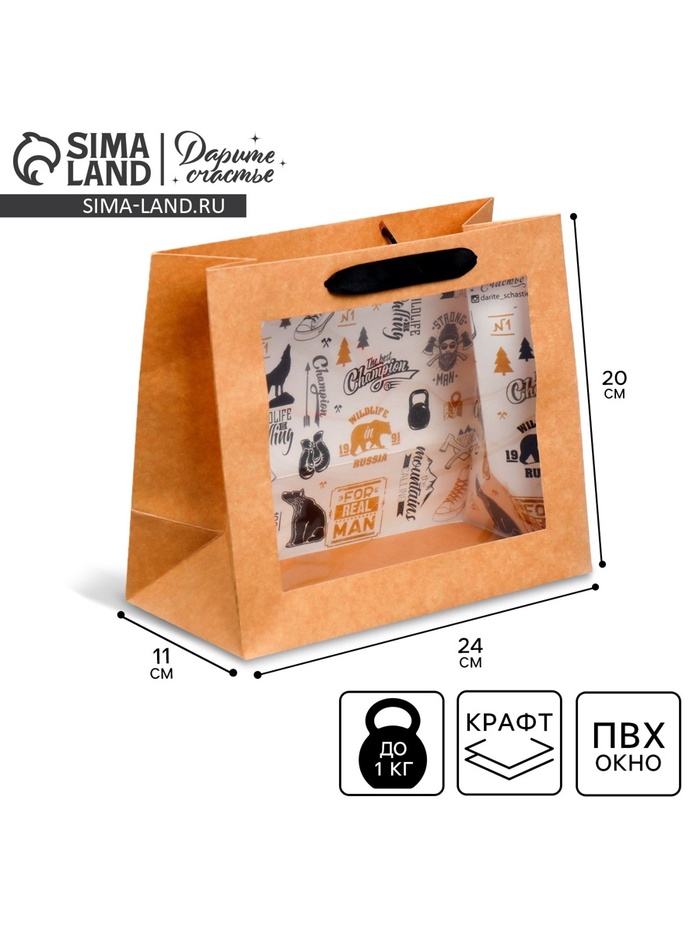 Пакет подарочный крафтовый с пластиковым окном, упаковка, Man, 24 х 20 х 11 см