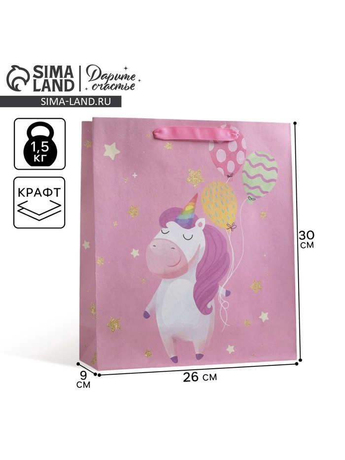 Пакет подарочный крафтовый, упаковка, «Единорожек», M 26 х 30 х 9 см