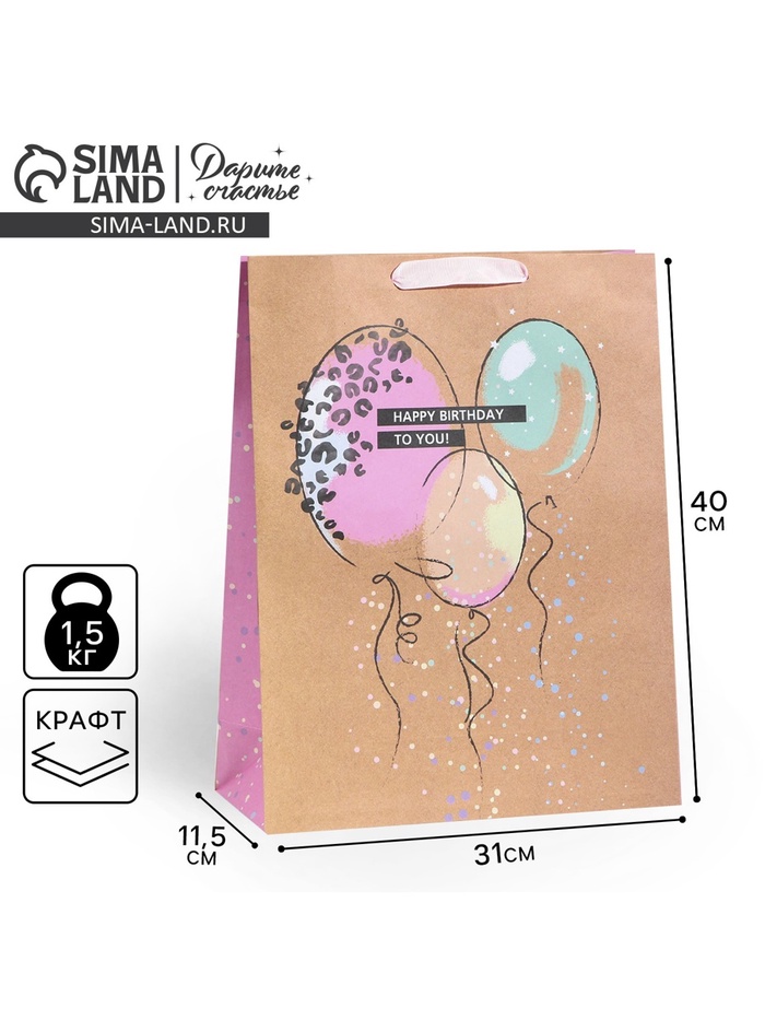 Пакет подарочный крафтовый, упаковка, Happy birthday, 32 х 28 х 15 см