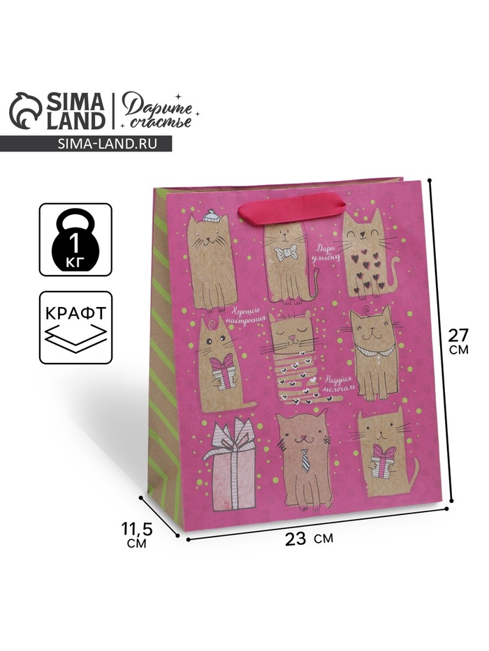 Пакет подарочный крафтовый, упаковка, «Милые котики», ML 23 х 27 х 8 см