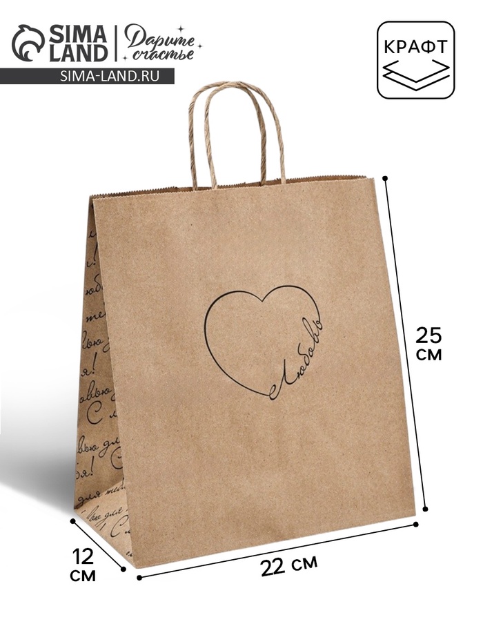 Пакет подарочный крафтовый, упаковка, «Love», 12 х 21 х 9 см