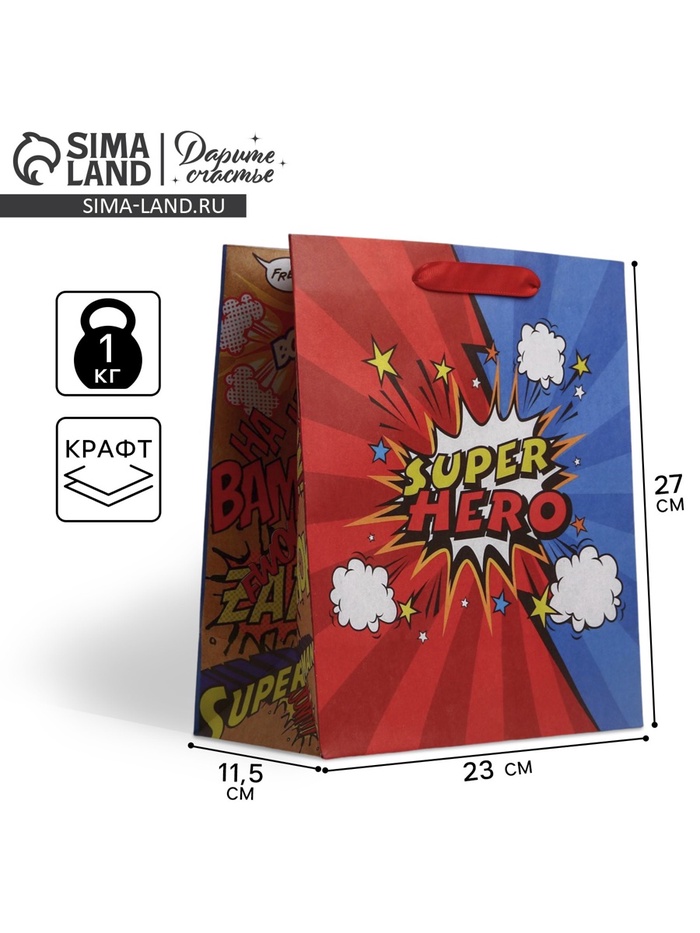 Пакет подарочный крафтовый, упаковка, «Супер герой», ML 23 х 27 х 11.5 см