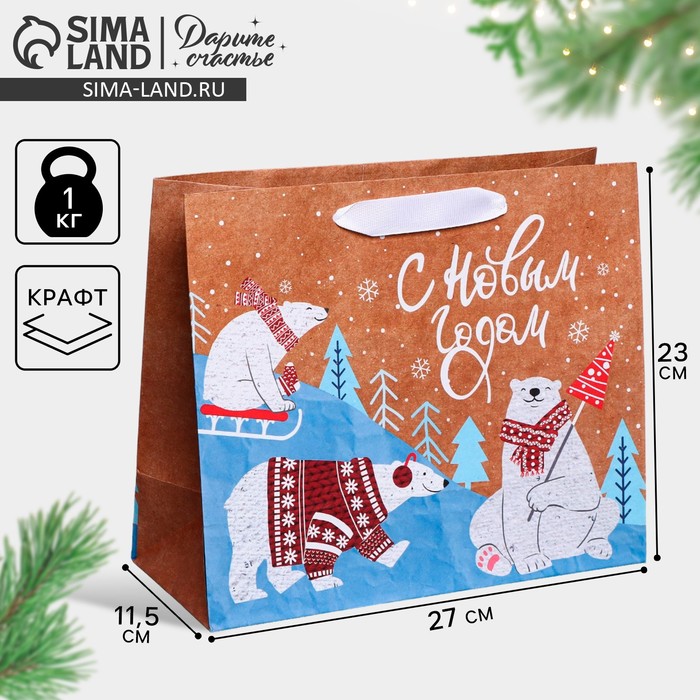 Пакет подарочный новогодний крафтовый «Белые медведи», ML 27 х 23 х 11.5 см