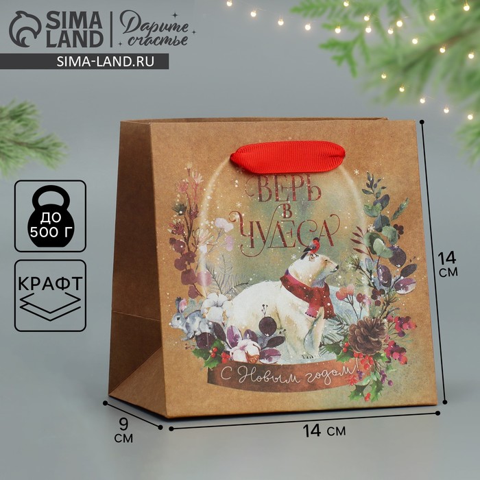 Пакет подарочный новогодний крафтовый квадратный «Верь в чудеса», 14 х 14 х 9 см
