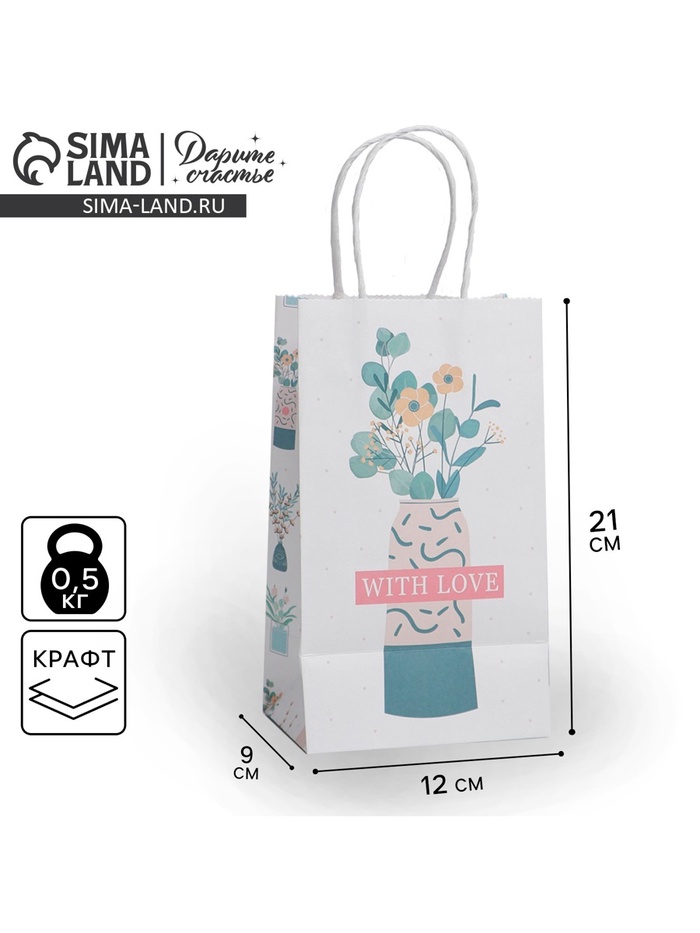 Пакет подарочный крафтовый «Люблю», S 12 х 5.5 х 15 см