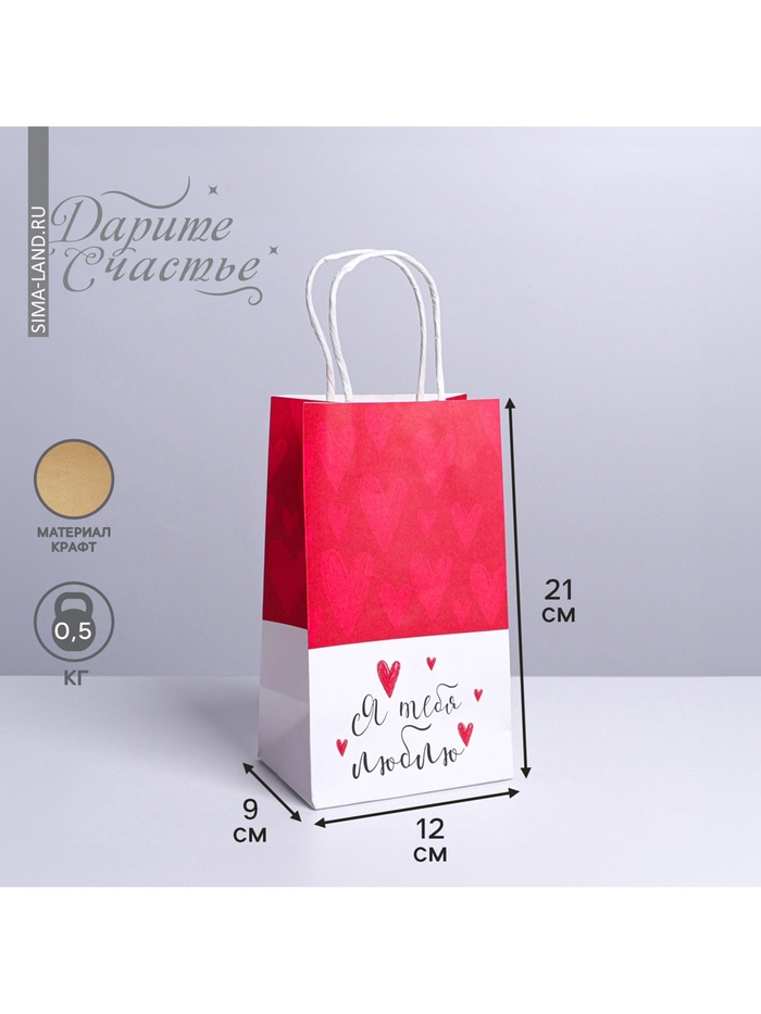 Пакет подарочный крафтовый, упаковка, «Я тебя люблю», 12 х 21 х 9 см
