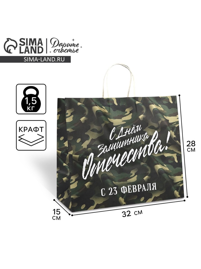 Пакет подарочный крафт «23 февраля», 32 х 28 х 15 см