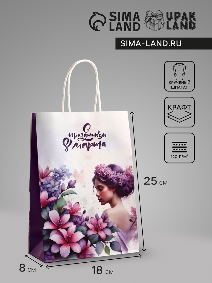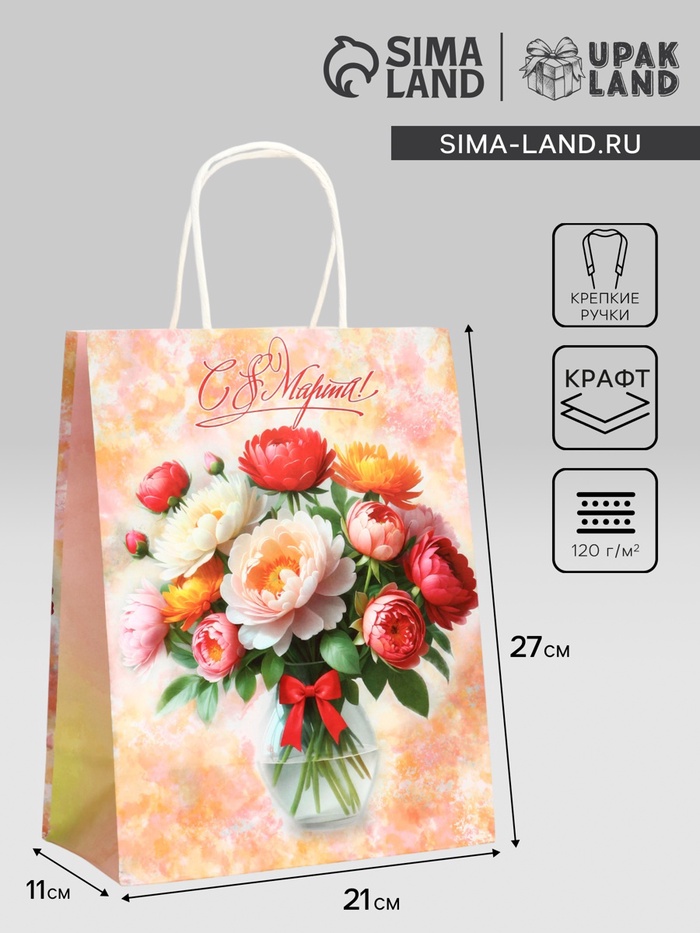 Пакет подарочный крафт «С 8 Марта!» 21×11×27 См