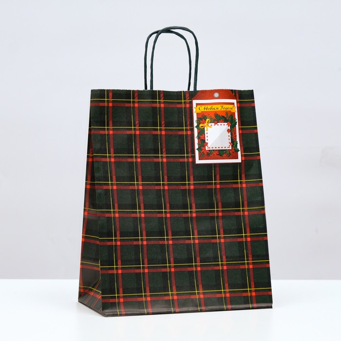 Пакет бумажный подарочный новогодний крафт «Зелёная клетка» 22×12×27 см