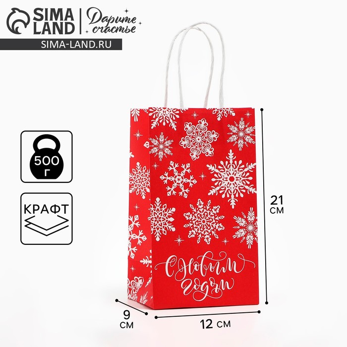 Пакет подарочный новогодний «Снежинки», белый крафт, 12 х 21 х 9 см