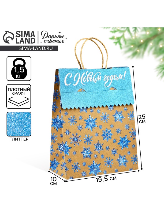 Пакет с клапаном «Снежинки», крафт, глиттер, 19.5 х 10 х 25 см