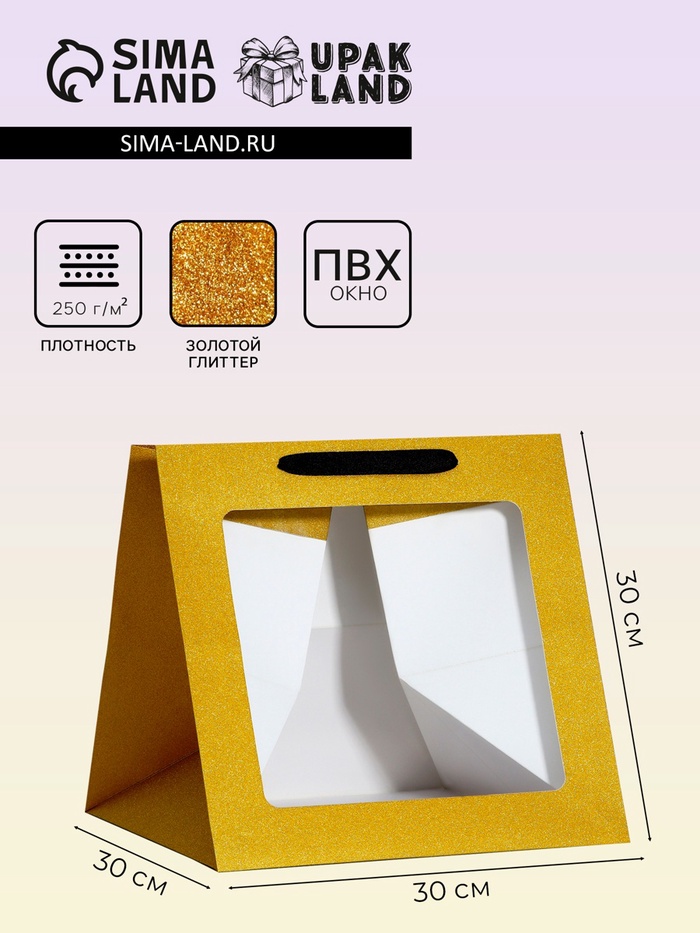 Пакет для торта и коробок, крафт с квадратным дном и окном, золото с глиттером, 30×30×30 см