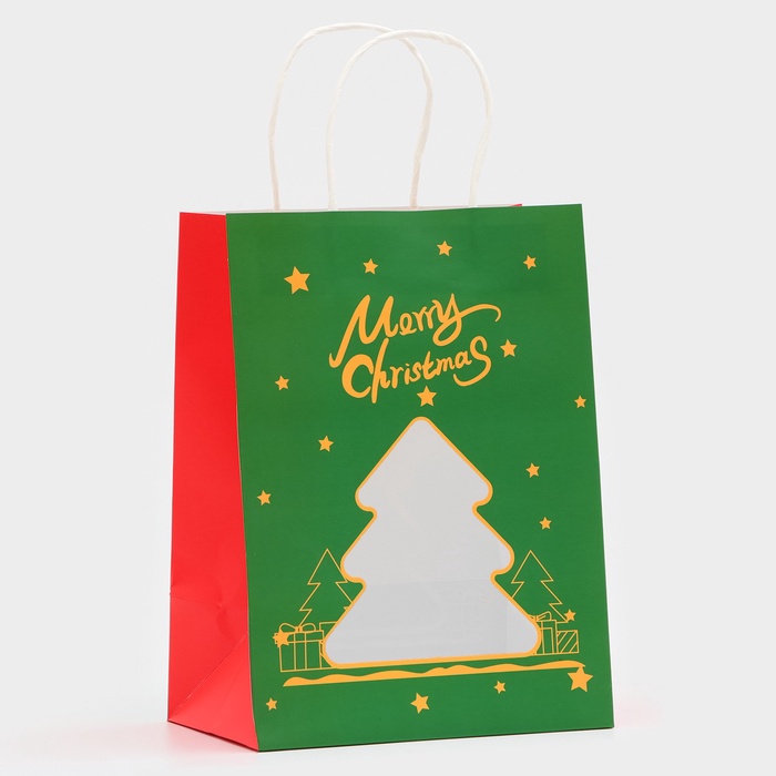 Пакет подарочный бумажный с окном «Ёлка» 19×26×13 см, крафт зеленый
