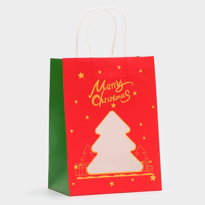 Пакет подарочный бумажный с окном «Ёлка» 19×26×13 см, крафт красный