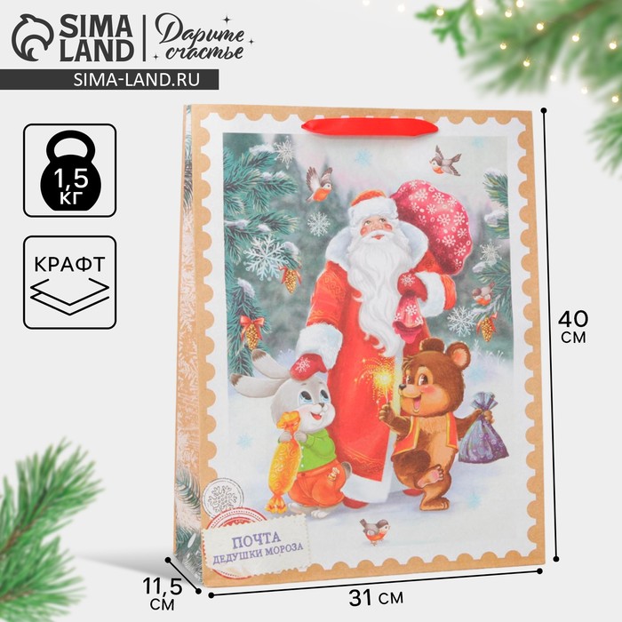 Пакет подарочный новогодний крафтовый «Дедушка мороз и зверята», L 31×40×11.5 см