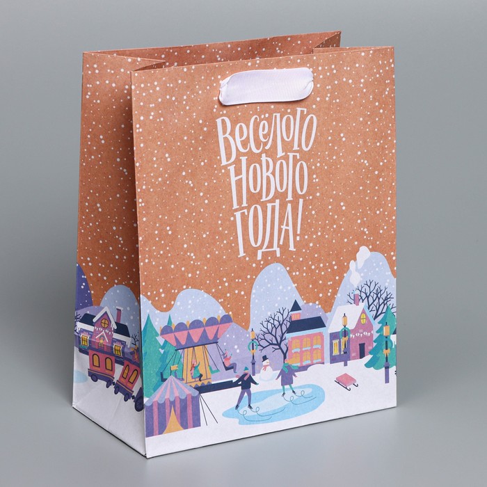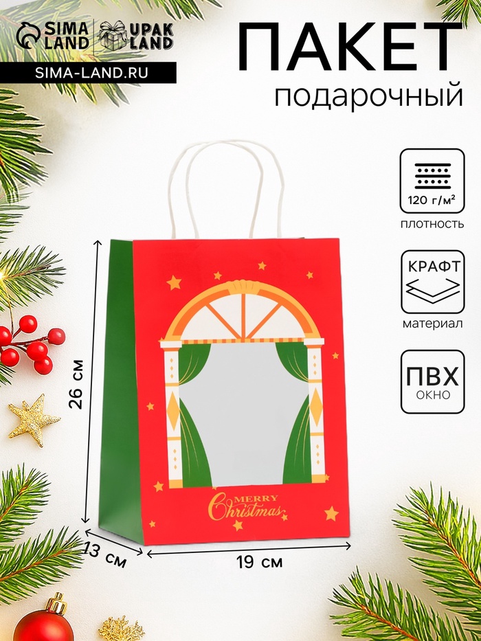 Пакет подарочный новогодний крафт с окном «Театр» 19×26×13 см
