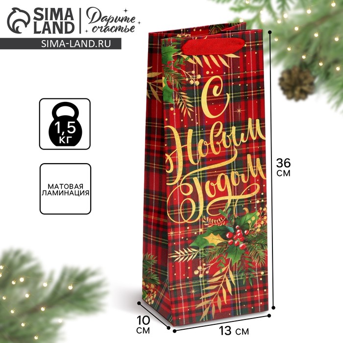 Пакет подарочный новогодний ламинированный под бутылку «Новогодний венок»,13×36×10 см