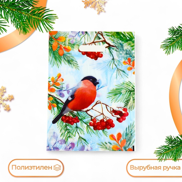 Пакет подарочный новогодний «Снегирь на ветке рябины», полиэтиленовый с вырубной ручкой, 30×40 см