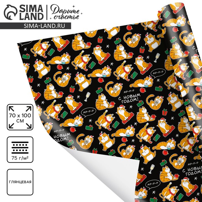 Упаковочная бумага на Новый год «Коты новогодние», 70 х 100 см, глянцевая