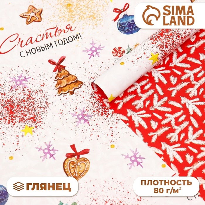 Бумага упаковочная глянцевая двусторонняя «Счастья в Новом году!», 68×100 см