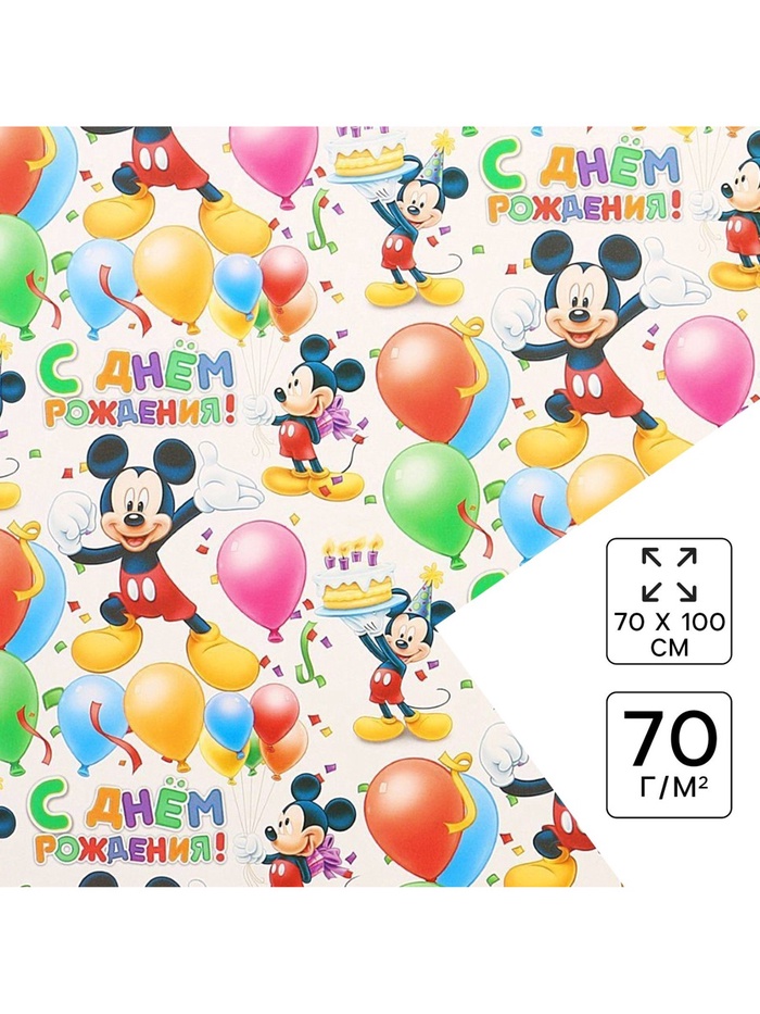Бумага упаковочная глянцевая «С днём рождения», Микки Маус, 70x100 см
