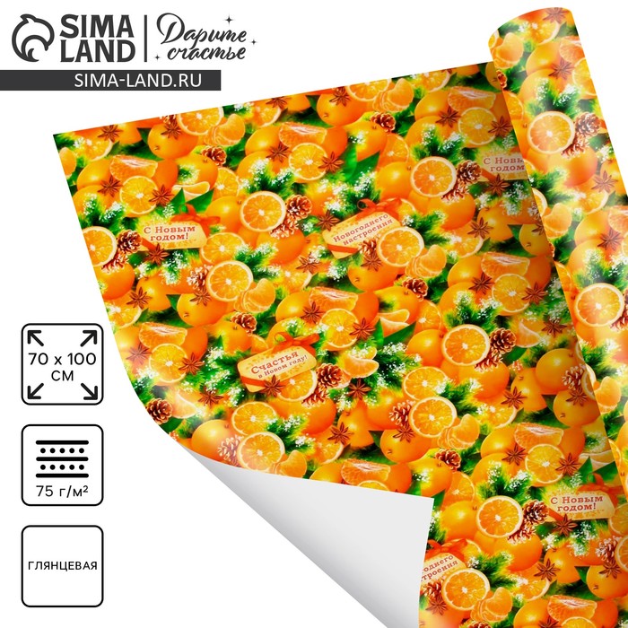 Упаковочная бумага на новый год «Пряные мандарины», 70 х 100 см, глянцевая