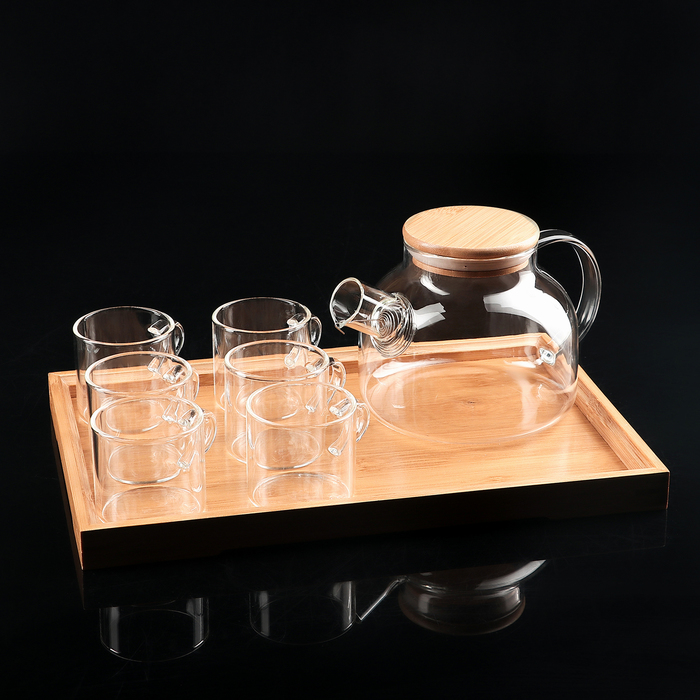 Набор чайный из стекла на деревянной подставке «Эко», 7 предметов: чайник 1,1 л, 5 кружек 120 мл, подставка