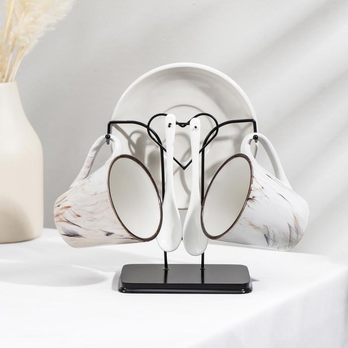 Набор чайный керамический на металлической подставке «Мрамор», 6 предметов: 2 чашки 200 мл, 2 блюдца d=14 см, 2 ложки