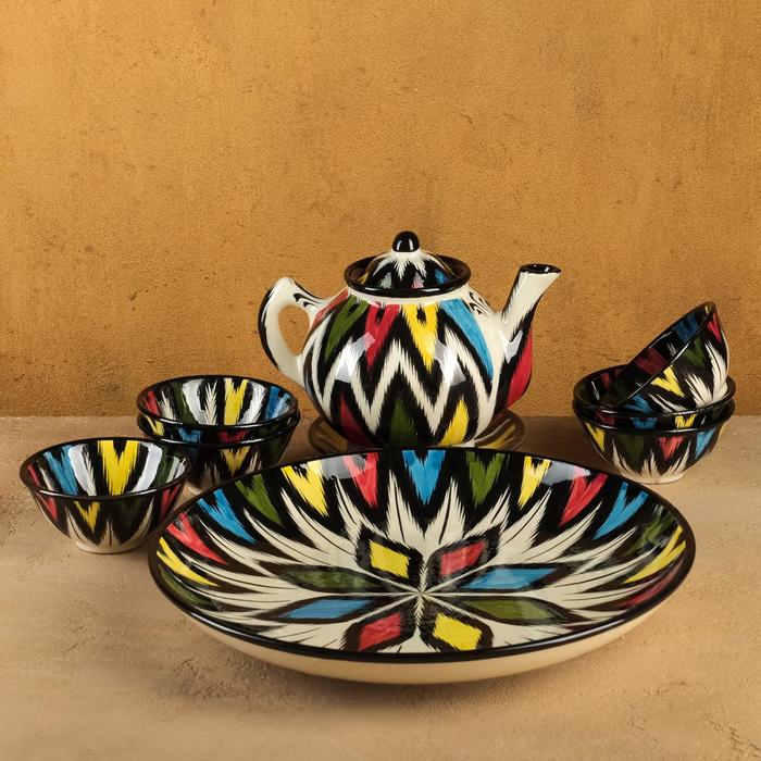 Набор чайный Риштанская керамика «Атлас», 9 предметов: чайник 800 мл, пиалы 200 мл, ляган, разноцветный