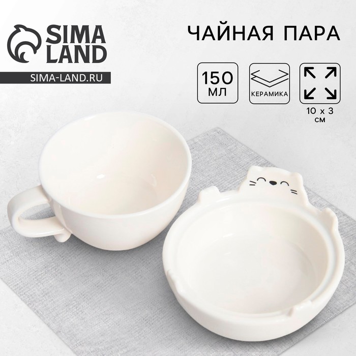 Кружка с блюдцем Дорого внимание «Белый кот», керамика, 150 мл, 10 х 3 см, белая