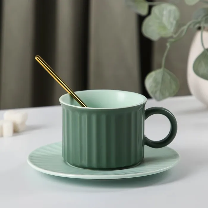 Чайная пара керамическая «Профитроль», 3 предмета: чашка 180 мл, блюдце d=13,7 см, ложка, цвет зелёный