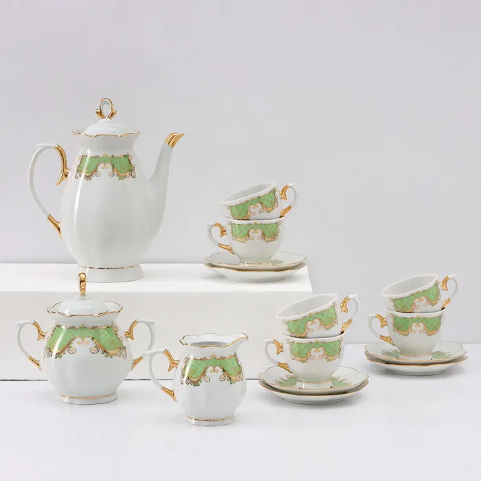 Сервиз кофейный фарфоровый «Симфония», 15 предметов: кофейник 800 мл, сахарница 400 мл, сливочник 180 мл, чашка кофейная 110 мл, блюдце d=12 см