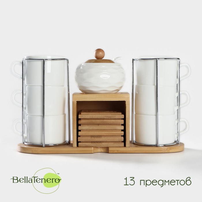 Набор чайный керамический на деревянной подставке BellaTenero, 13 предметов: 6 чашек 150 мл, сахарница с ложкой 200 мл, 6 подставок, белый