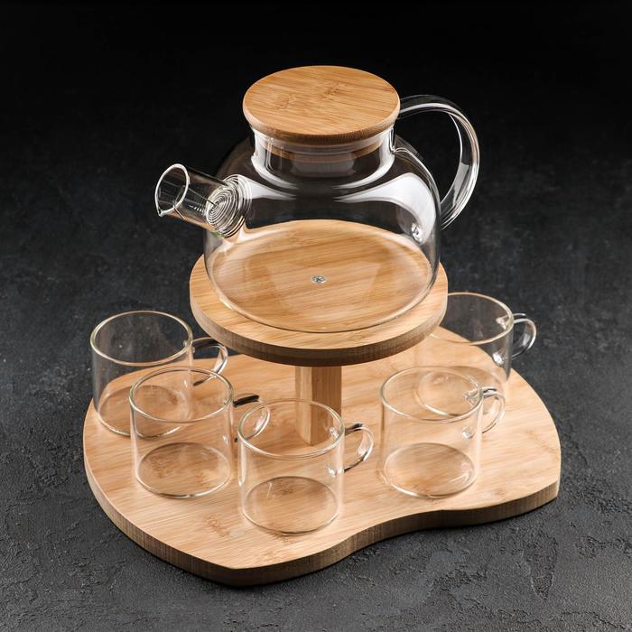 Набор чайный из стекла на деревянной подставке «Эко», 7 предметов: чайник 1,1 л, 5 кружек 120 мл, подставка