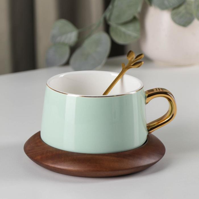Чайная пара керамическая с ложкой «Улун», 2 предмета: чашка 280 мл, блюдце d=13 см, цвет светло-зелёный