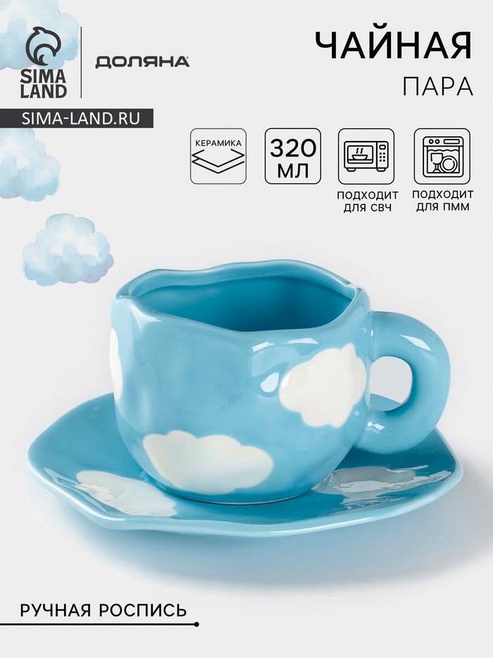 Чайная пара Доляна «Облако», 320 мл, блюдце d=16 см, ручная роспись, керамика, голубая