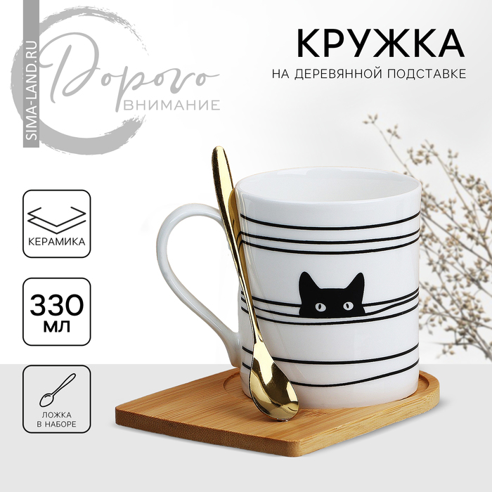 Кружка керамическая на деревянной подставке «Прятки», 330 мл, с ложкой, белая