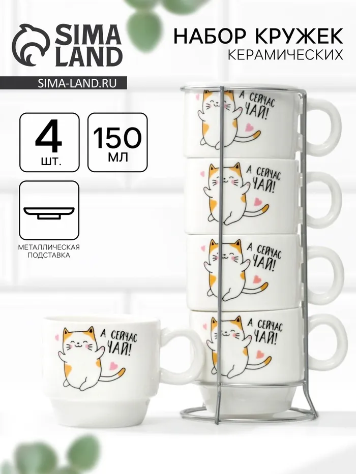 Кружки керамические на металлической подставке «А сейчас чай», 4 шт. по 150 мл