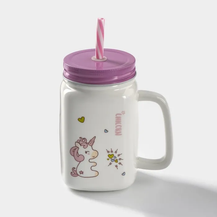 Кружка керамическая с металлической крышкой и трубочкой «Единорог», 450 мл, цвет МИКС