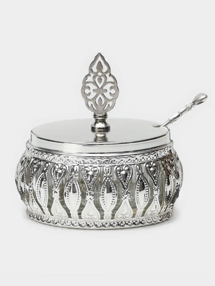 Сахарница «Ажур», 200 мл, 10×10 см, с ложкой, серебристая