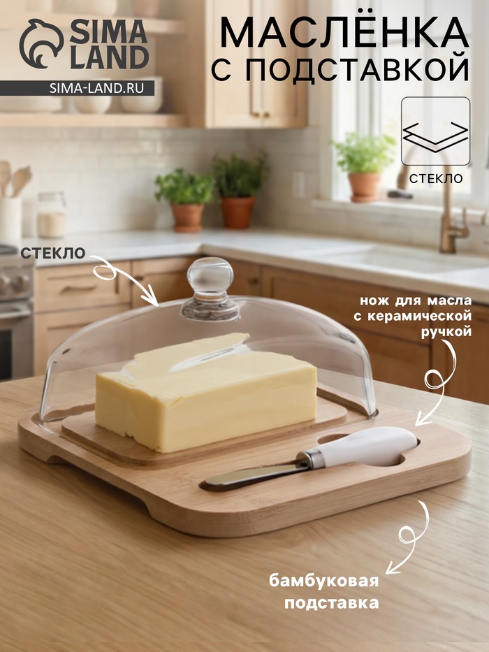 Маслёнка, 19×18×9.5 см, с ножом, на бамбуковой подставке, стекло, прозрачная