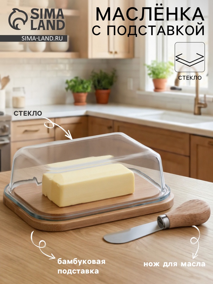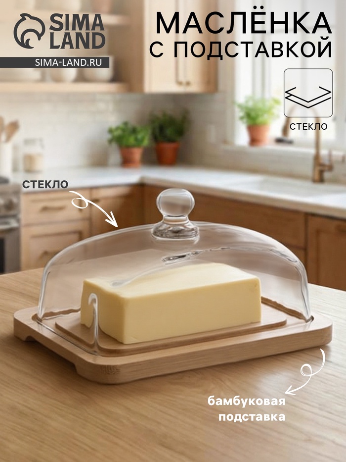 Маслёнка, 17.8×13×10 см, на бамбуковой подставке, стекло, прозрачная
