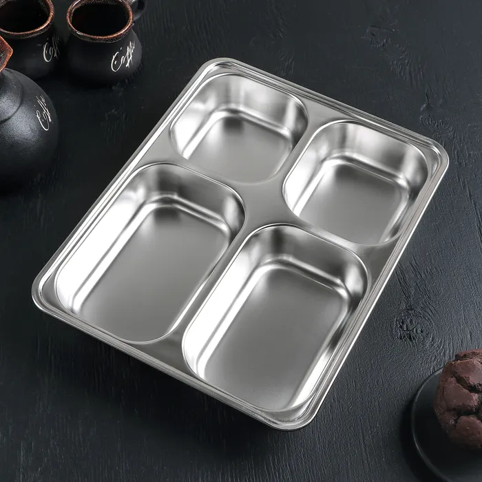 Поднос глубокий из нержавеющей стали, 4 секции, 28×22×4,5 см, 420 мл/280 мл