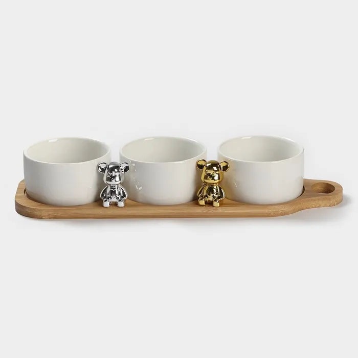 Набор соусников на деревянной подставке «Стильный Мишка», 4 предмета: 3 соусника 120 мл, подставка, керамика